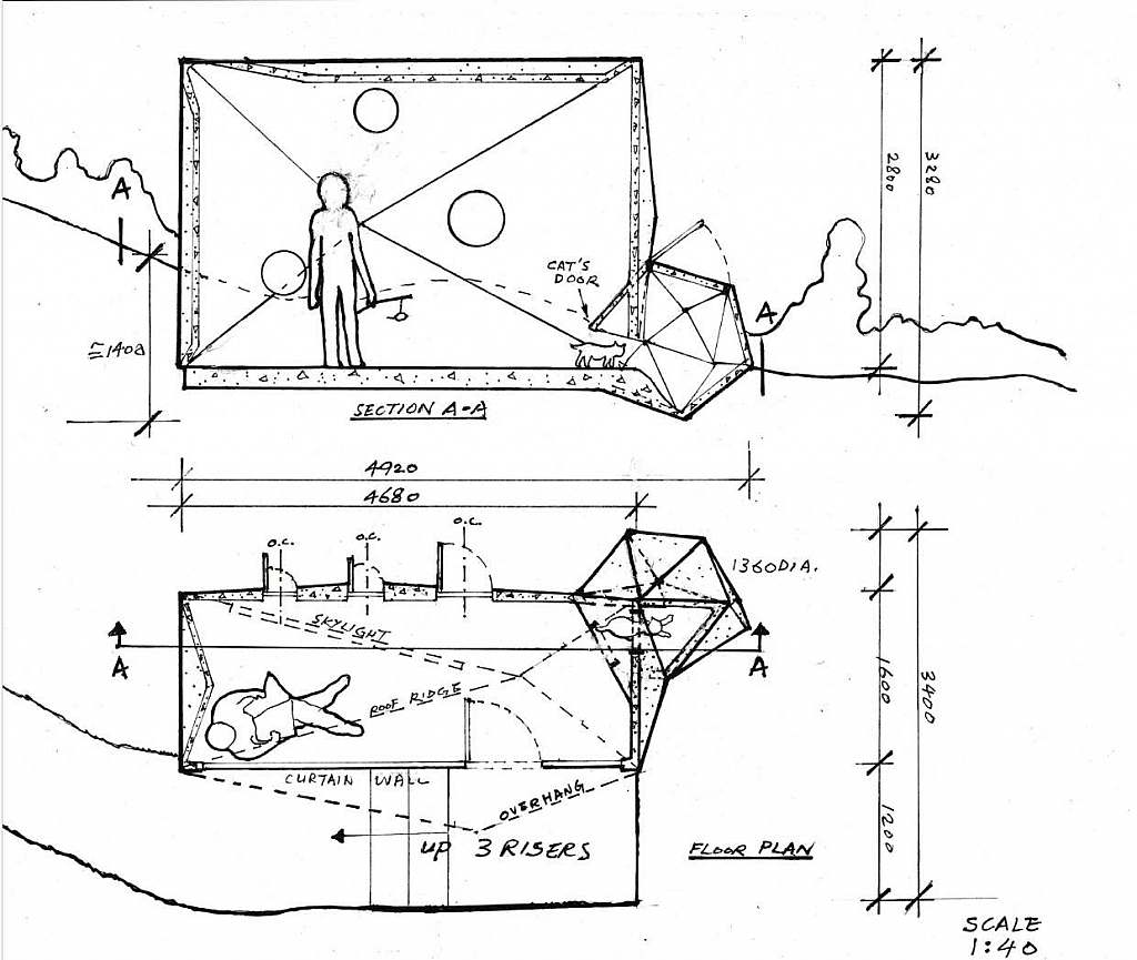 A place is a location created by human experience in contrast to space and a place’s unique atmosphere can be described as Genius loci. In order to create Genius Loci for my room of solitude with my cat as a place of refuge, I adopted the minimalistic light strip and inclined walls of Tadao Ando. A triangular door frame for the basement of my cat created a mythic path of t ravel in this small unit. It ‘s a small building in a warm hillside with plenty of sunshine.